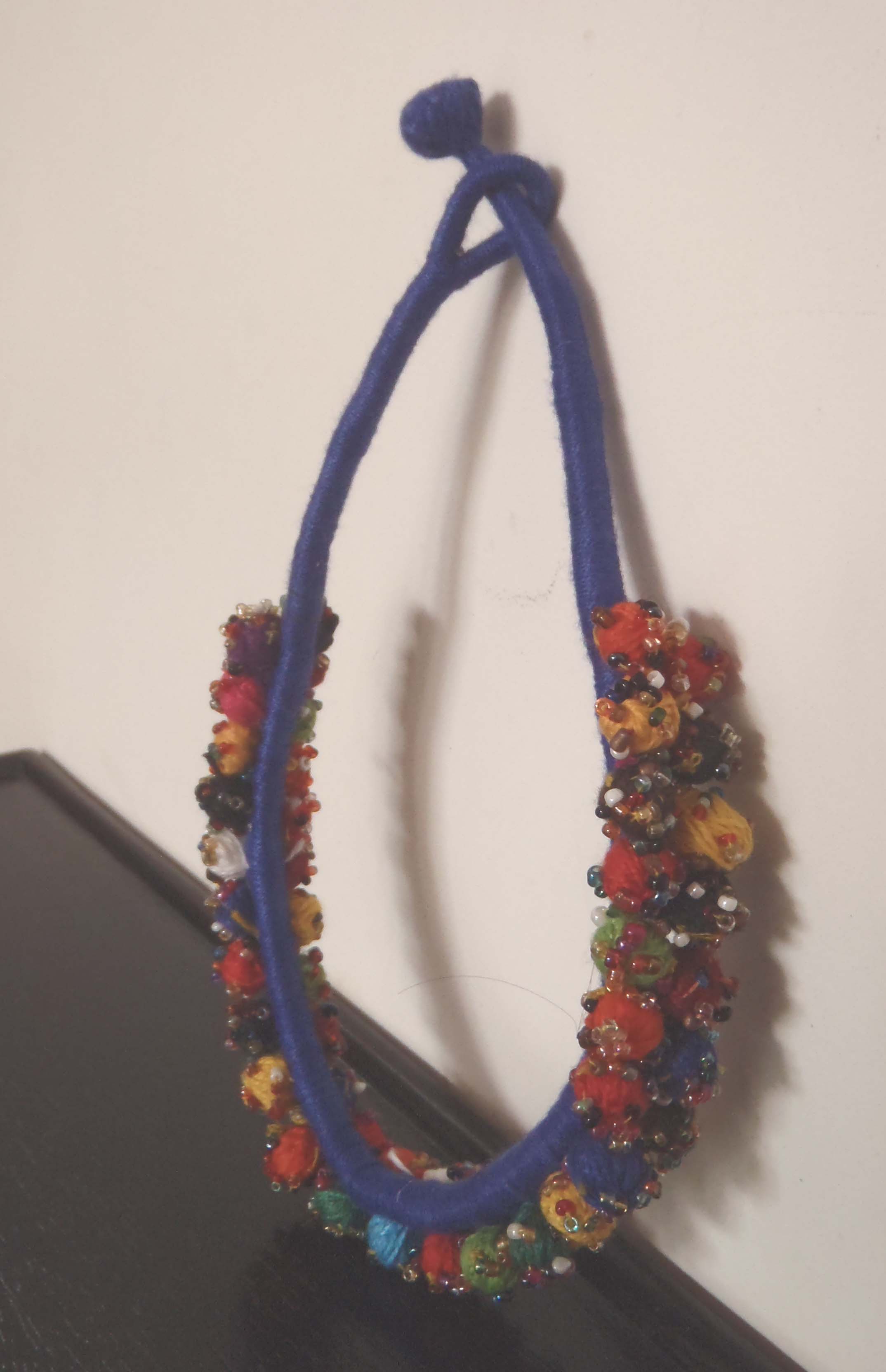This piece of jewelry comes from our small time artisans and women in slum areas of Jaipur and outskirts of Jaipur. The artisans here make jewelry out of thread and metal pieces. This neck-piece has been created by the old and skilled women from small villages.