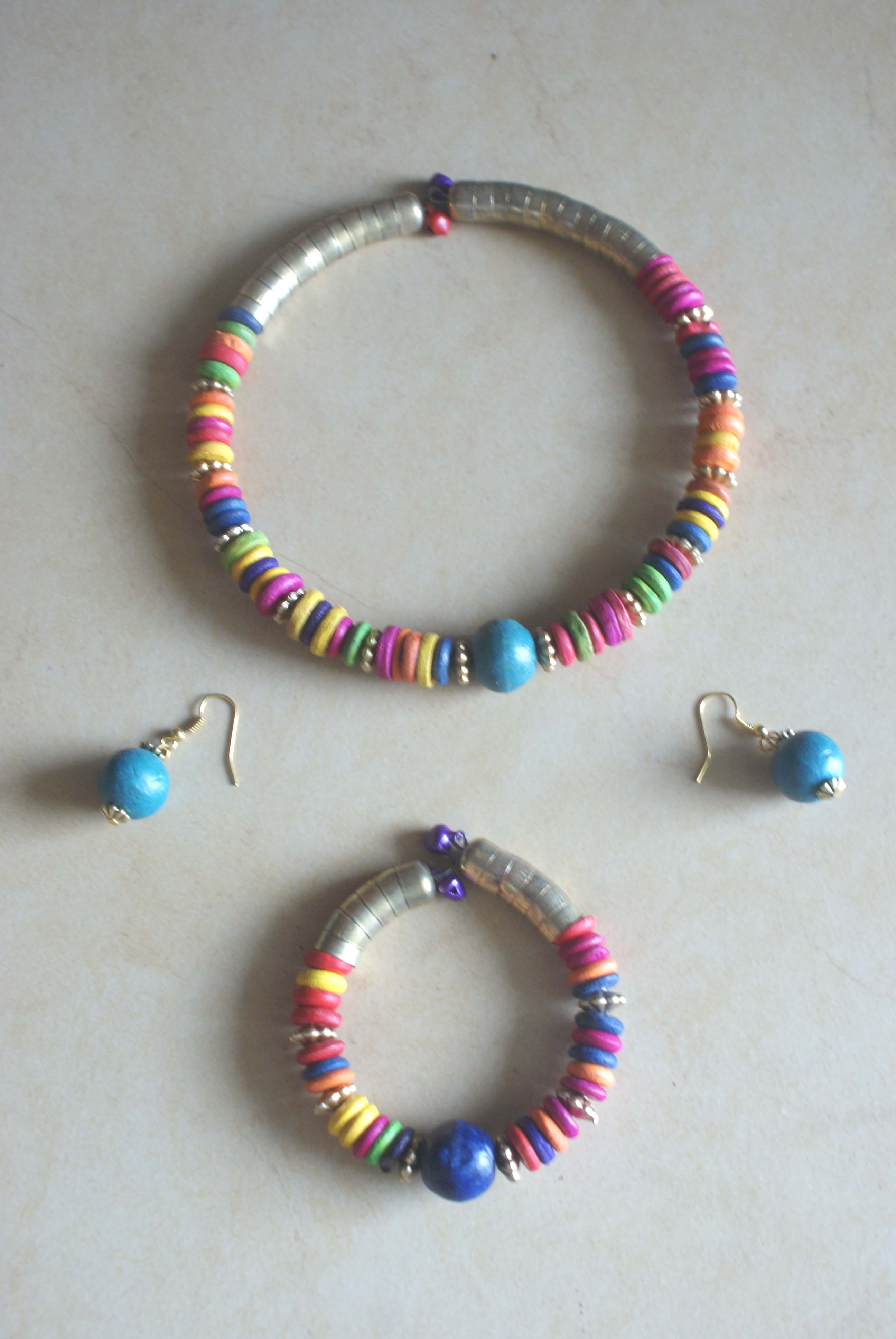 Young, peppy and gypsy set of necklace, earrings and bracelet, this wooden and metal beaded jewelry set is very vibrant and something not to let go of.