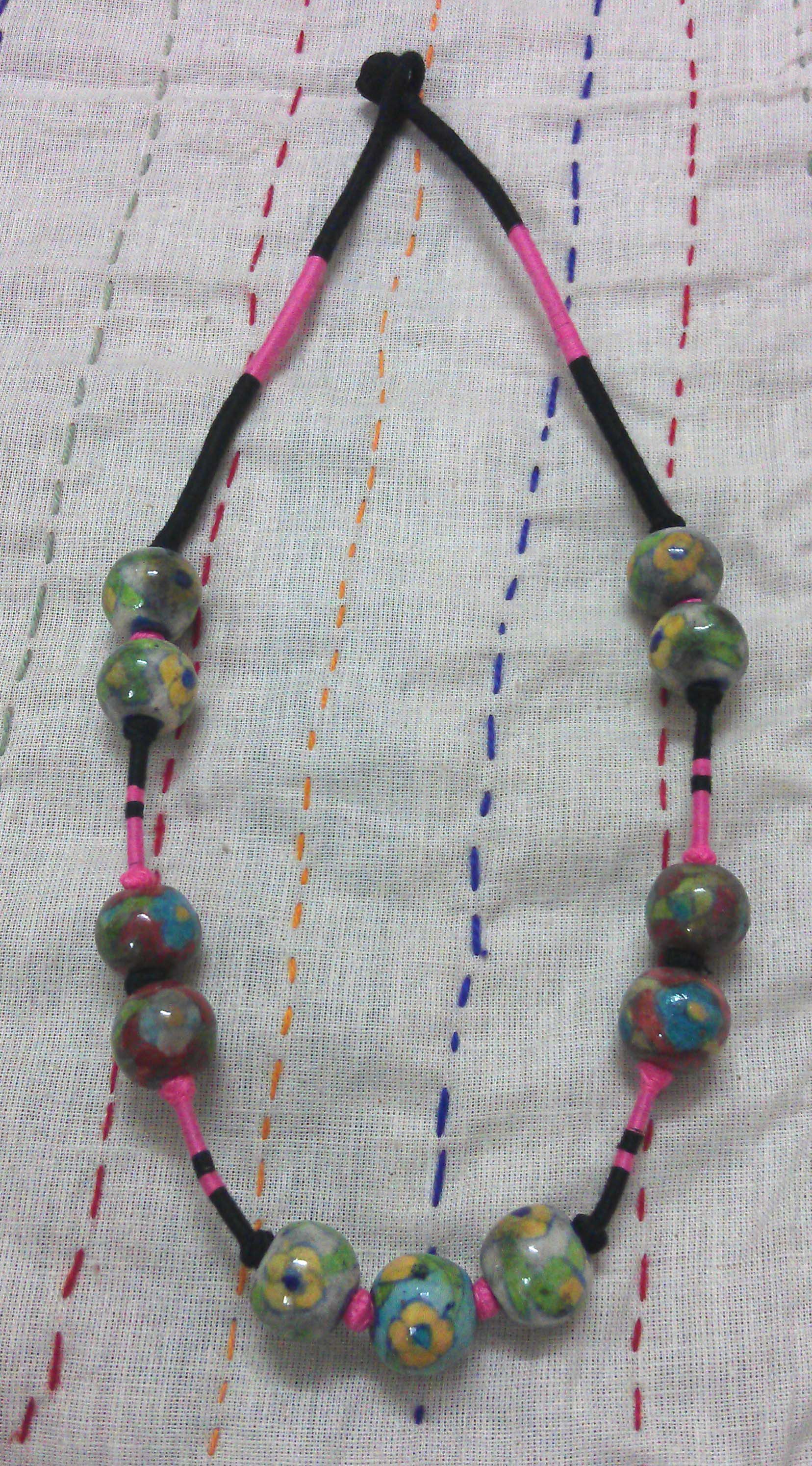 This combination of blue pottery hand painted stone and lustrous cotton thread is rare and very artistic.