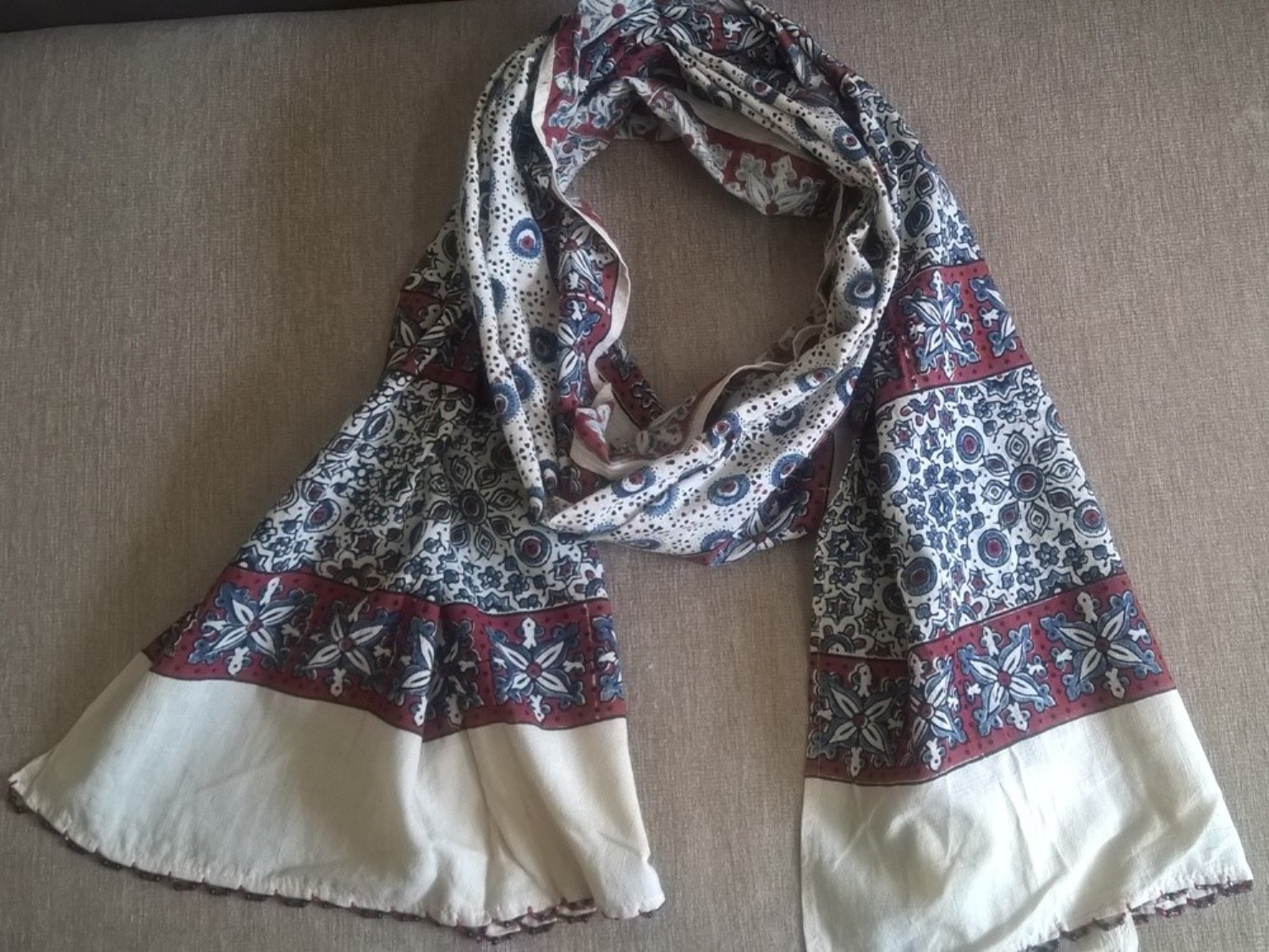 Natural and organic ingredients have been used to create this Ajrak printed Scarf in colors like beige, indigo, mustard, red, black and green. The beaded edging enhances the look.