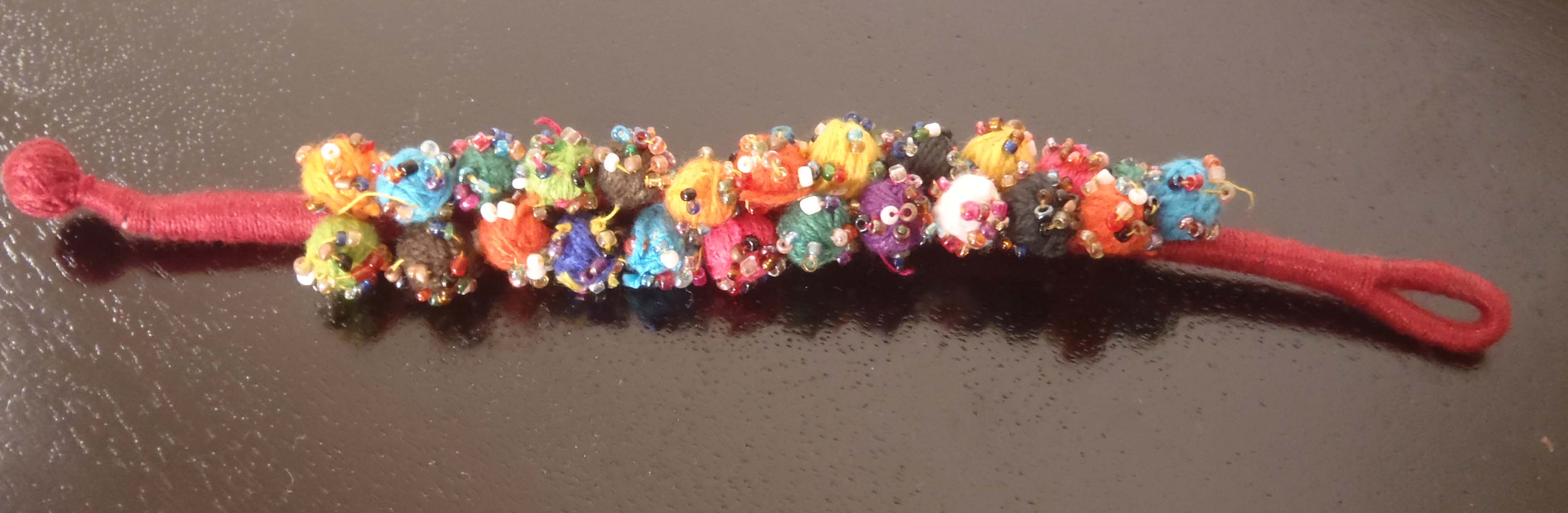 A lively accessory to give you a vibrant, gypsy look with whatever you wear for that beach party, college party, shopping with girls or your weekend brunch. This bracelet is made of cotton threads with pom-poms and beads.