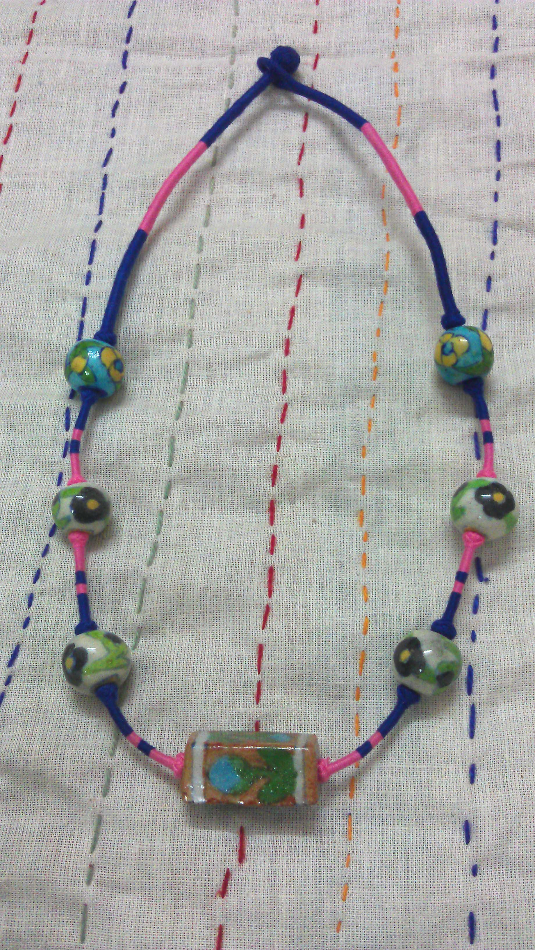 This combination of blue pottery hand painted stone and lustrous cotton thread is rare and very artistic.